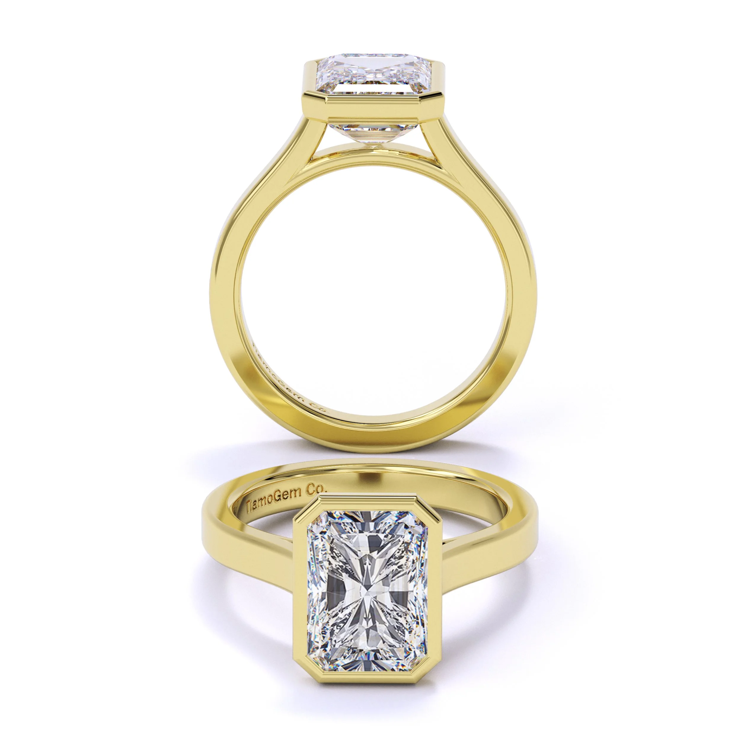 Tatum is a modern take on the classic bezel cathedral — durable, refined, and effortlessly elegant. It features a sleek plain gold band and an open gallery that allows light to flow through, maximizing the brilliance of the center stone. With its smooth lines and semi-round band, Tatum perfectly balances strength and sophistication.